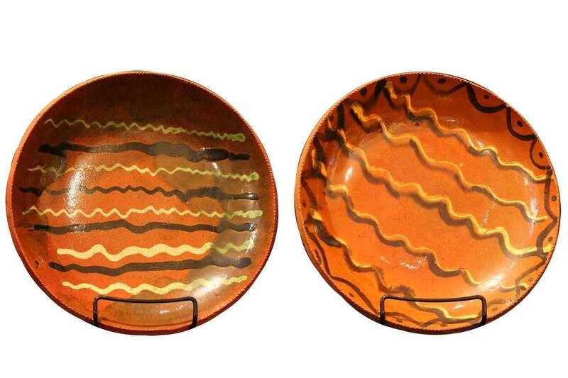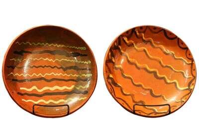 The first, decorated with black and yellow and rim swags and dots; the second, decorated in green and black.