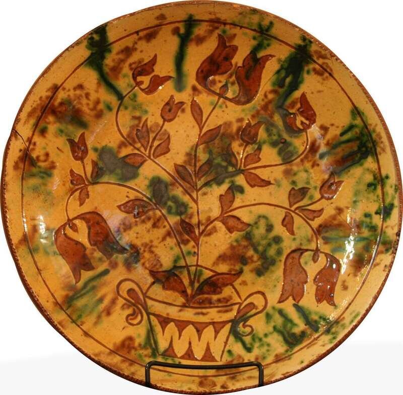 Shallow bowl form decorated with potted tulip, yellow with green and brown splotches.