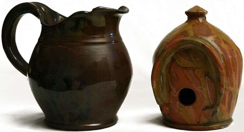 Glazed redware birdhouse and pitcher thomas stahl, 1935 and j.s.stahl, 1940