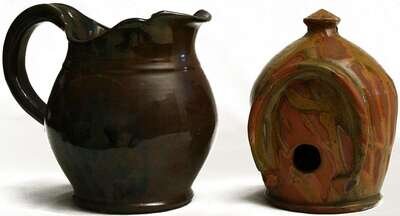 Each incised with maker's name, the birdhouse with green, yellow and orange glaze, the pitcher with manganese glaze.