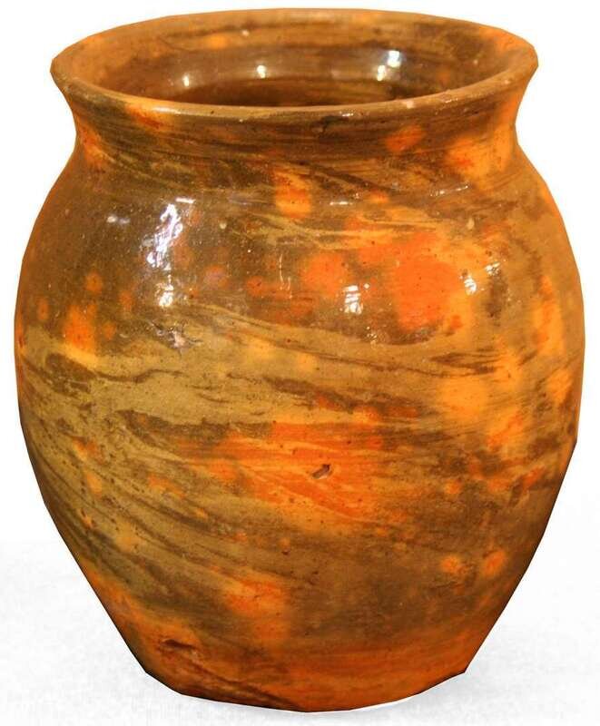 Green and orange glazed redware jar attributed to john george schweinfurt (1825-1907), new market, va