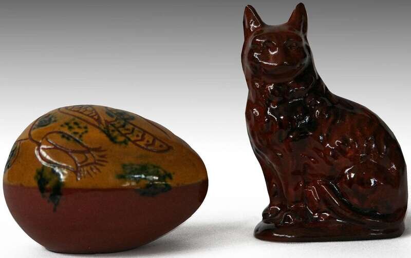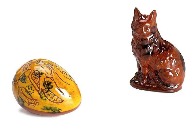 Glazed and Sgraffito redware easter egg and molded redware cat Lester B. Breininger, 1968 and breininger pottery 1989