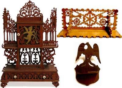 The first, a wall shelf, with rectangular scalloped-edge shelf with pinwheel and bird openwork backboard with similarly pierced brackets; the second, a small wall shelf with eagle and shield shaped backboard with arched shelf; together with a fretworked table top cabinet with Gothic scrolled openwork centering cupid-carved door and drawer on scrolled feet.