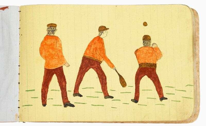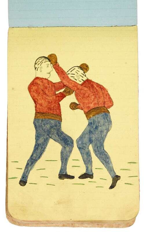 Seventeen drawings including soldiers, William Penn and an Indian, boxers, apple tree, bear and an Indian, cricket players, horses, Wild Bill Cody, watercolor, ink and graphite on lined paper.