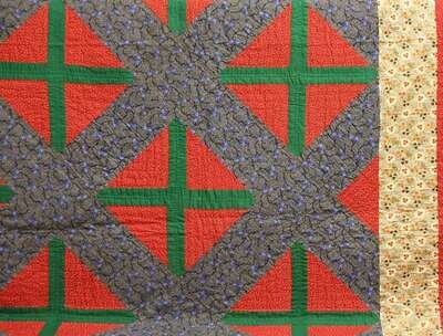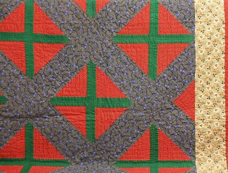 Comprised of printed cotton patches in red, blue, black, gold and white, and solid green in a geometric design of criss-crossed squares within a grid, heightened with diagonal line quilting.