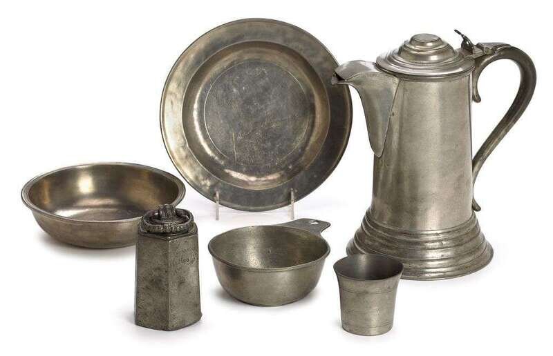 Including a tap-handled porringer bearing the initials "WMM" attributed to Simon Pennock, Chester, Pennsylvania; a plate and basin with worn touch marks; a flagon marked "L.B. Taunton Brita. Manf. Co."; a beaker; and a hexagonal flask bearing the inscription, "Zacharias Haaf 1794."