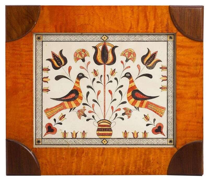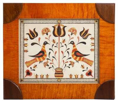 Pamela Stafford Godillot (1938- ) fraktur: potted tulip and striped birds