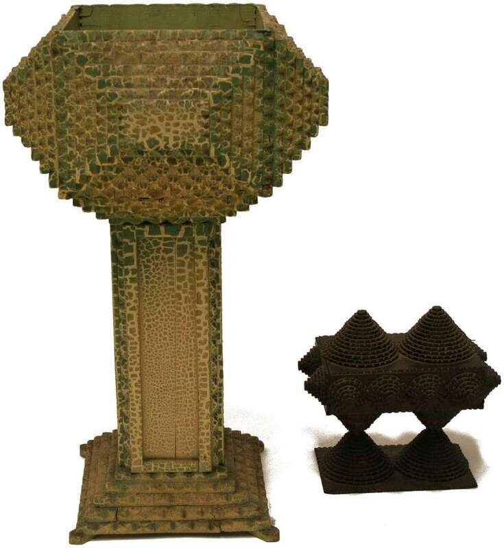 The box decorated with stepped cones on top, sides and raised on double conical base; the plant stand painted white and green with open square box with stepped sides on a paneled support and stepped squared base.