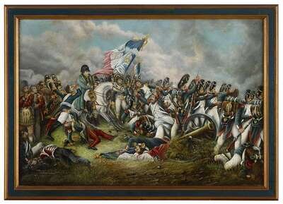 Hand-written inscription to verso, "Battle of Waterloo June 18, 1815 Painted by Jos. Relinger 1899," oil on canvas, framed.