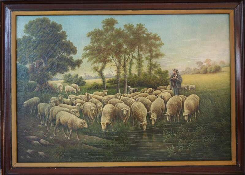 Joseph Relinger shepherd and his flock at stream, possibly a self-portrait
