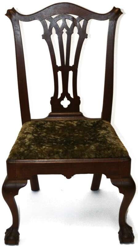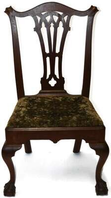 Serpentine crestrail above pierced "Gothic" splat, trapezoidal seat on shaped apron, cabriole legs ending in ball and claw feet.