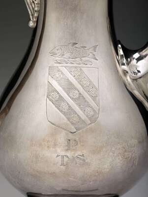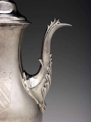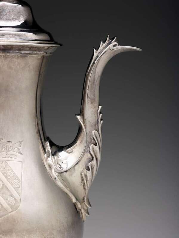 A graceful pear shape with an urn finial on a domed lid, hinge fixed to the upper handle post, the plain body having a leaf-chased curved spout, carved lyriform pearwood handle on a plain circular foot. The right side engraved with the Penrose Family crest comprising a shield with three slanting stripes, each with three rosettes and stippled field, surmounted by a twisted rod and fish, "TSP" engraved below crest.