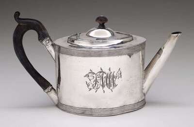 Oval shape with straight sides, mushroom shaped wooden finial, reeded bands to rim and base, straight tapering spout, loop-shaped ebony handle, monogram.
