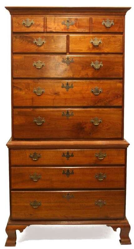 Upper case with molded cornice and six thumb-molded drawers, the lower case with three thumb-molded drawers, on ogee bracket feet.