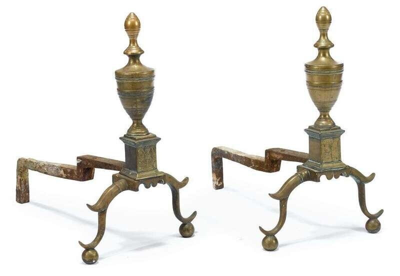 Pair Federal brass and iron andirons philadelphia, pa, circa 1800