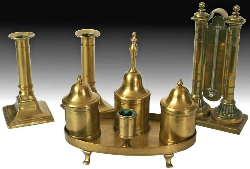 Brass tabletop thermometer, pair of candlesticks and ink stand thermometer inscribed, "Fisher Philada," early 19th century