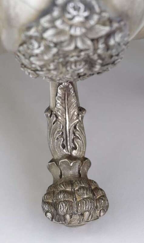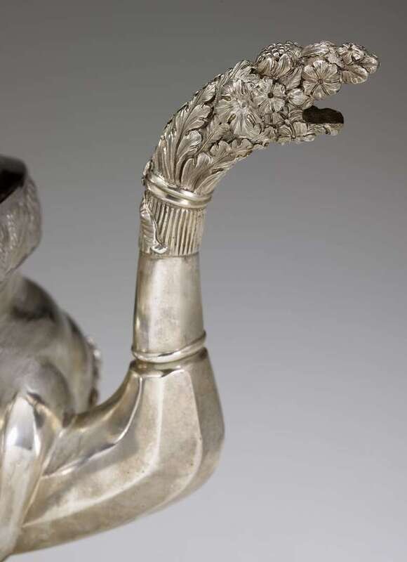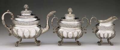 Comprising a teapot, covered sugar bowl and creamer, all of oblong shape with lyre-form leaf cast handles; the teapot and sugar bowl with grape bunch and leaf cast finial above an oblong top with matching grape and leaf decoration, a band of grapes and leaves at the top and midband, melon form bodies with four floral and leaf repoussé panels terminating in leaf cast legs on hairy paw feet, the teapot with paneled curved spout terminating in a floral and leaf cast bird's head; the creamer matches other two pieces in form and decoration, monogram.