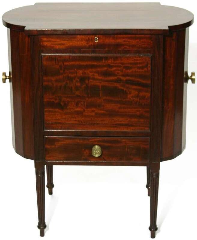 The shaped, hinged top opens to well, single beaded drawer, faceted ends, reeded posts, reeded legs ending in peg feet.