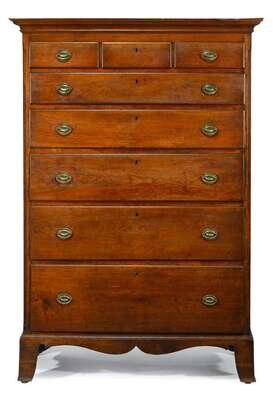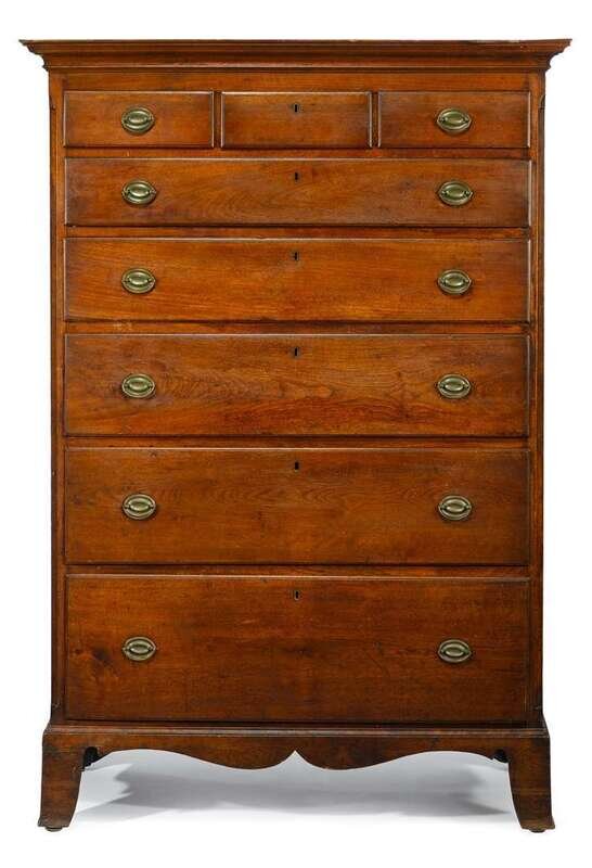 The molded cornice above three short and five graduated drawers with molded edge on a shaped apron and tall bracket feet.
