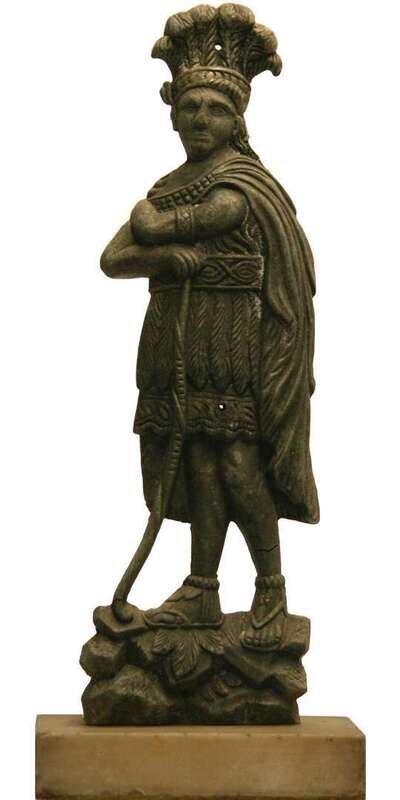 Flattened figure of a standing Indian mounted on a marble base.
