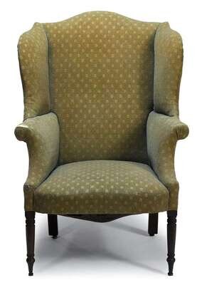 Arched back enclosed by shaped wings and outscrolled arms, on ring turned tapering legs.
