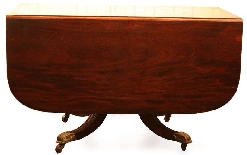 Rectangular top with deep "D"-shaped leaves on a boldly turned urn-form support on downswept molded legs with brass cap feet.