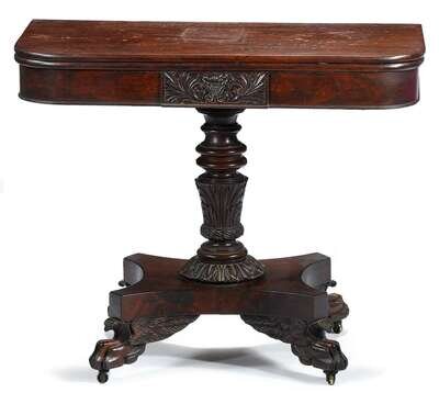Classical carved mahogany games table attributed to anthony g. quervelle (1789-1856), philadelphia, pa