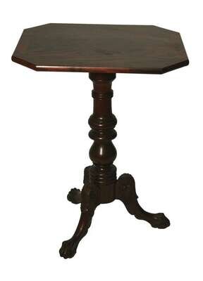Rectangular top with canted corners tilts on ring turned, urn form shaft on arched, leaf-carved legs ending in paw feet.