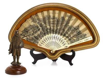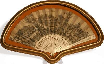 Supported by lacquered sticks and guards, and displayed within a frame, this unique folding fan proudly displays the biblical inscription as seen on the U.S. Liberty Bell; "Proclaim Liberty Throughout All The Land Unto All The Inhabitants Thereof." Beneath this motto a color illustration depicts a view of the innovative manufacturing and engineering marvels of a burgeoning American industrial revolution: railroads, factories, suspension bridge, modern weaponry, hot-air balloon, telegraph, iron-clad ships.