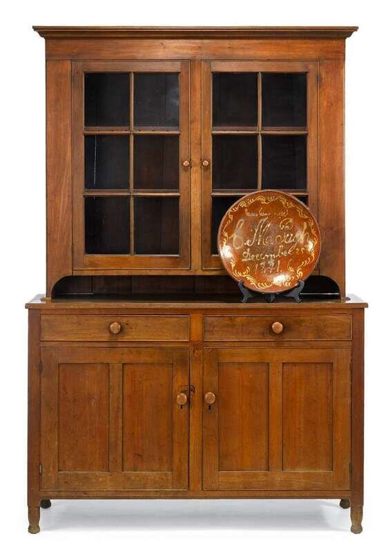 Molded and reeded cornice above two paned doors opening to shelves on base with reeded edge, two beaded drawers with turned pulls and two recessed paneled doors, turned feet.