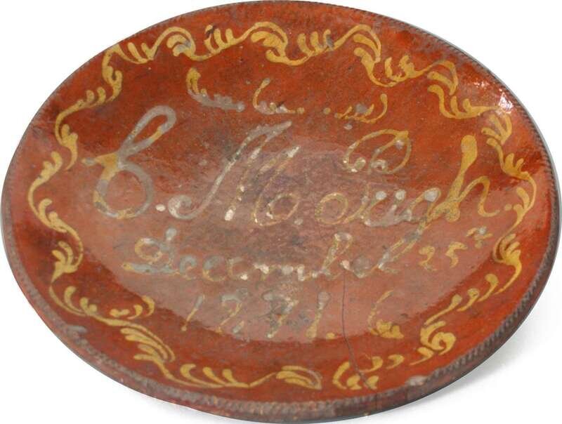 Glazed and slip-decorated redware presentation charger probably chester county, dated "1841"