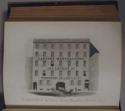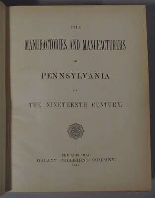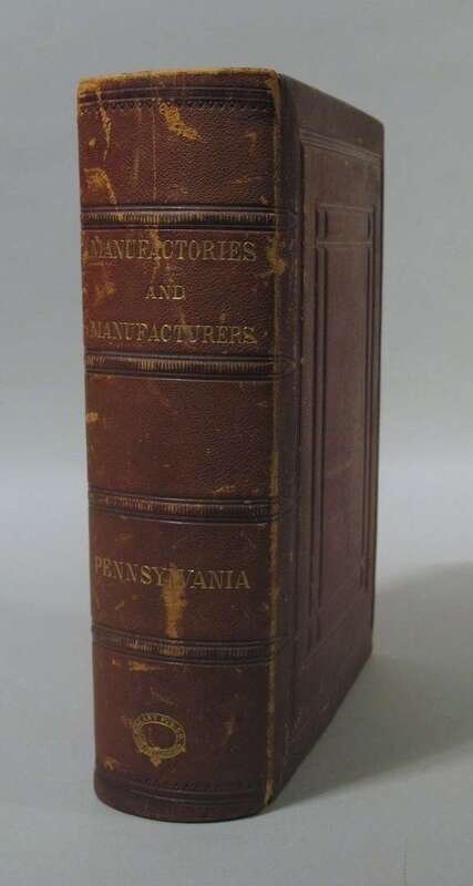 (Robson, Charles, editor.) The Manufacturies and Manufacturers of Pennsylvania of the Nineteenth Century. Philadelphia: Galaxy, 1875. 4to, orig. full-publisher's brown morocco, gilt-lettered spine, a.e.g., scuffed, joints rubbed. Numerous steel-engraved plates (portraits & views of factories). Internally generally clean & crisp.