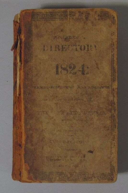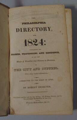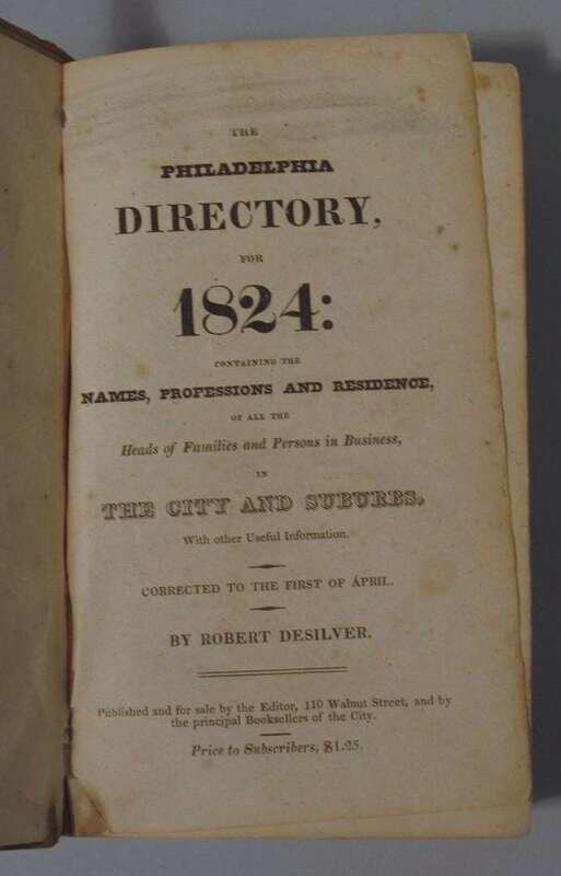 (Phila. Directory.) Desilver, Robert, editor. The Philadelphia Directory for 1824. [Philadelphia], [1824]. 12mo, orig. bds; rubbed & worn, back hinge crudely repaired. Scattered light foxing. Includes Bailey's Washington Almanac for 1824.