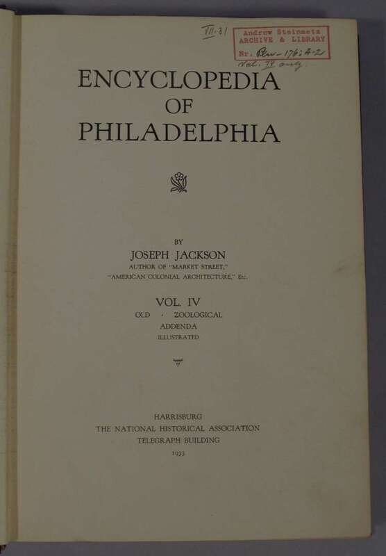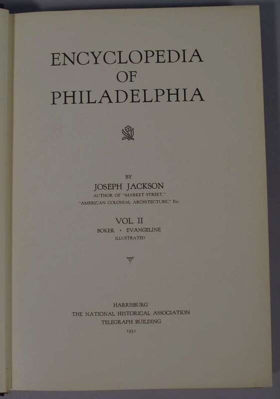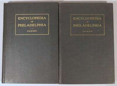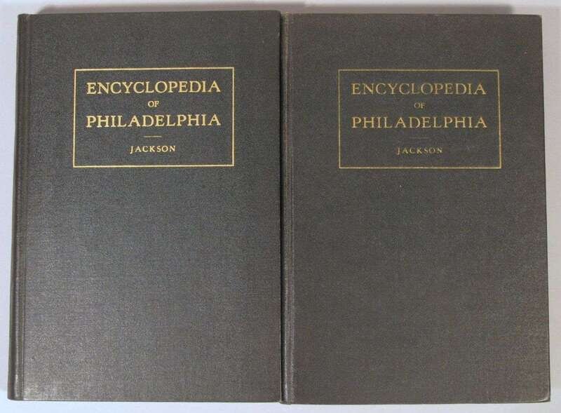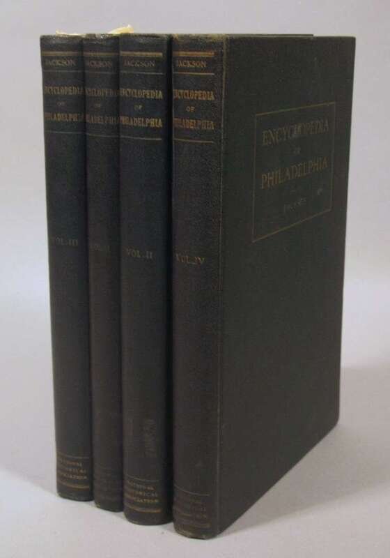 Philadelphia Reference: Scharf, J. Thomas; Westcott, Thompson. History of Philadelphia. 1609-1884. Phila: L.H. Everts, 1884. 3 vols. 4to, orig. gilt-lettered brown cloth, a.e.g,; light edge wear, occasionally scuffed, new endpapers. Plates, full page & text illus., fold maps. Internally clean. Sound set with repaired endpapers. * Jackson, Joseph. Encyclopedia of Philadelphia. Harrisburg, 1931-1933. 4vols. 4to, orig. gilt-lettered green cloth; light wear. Illus. Presentation copy inscribed and signed by Joseph Jackson on front blank in vol. 1.