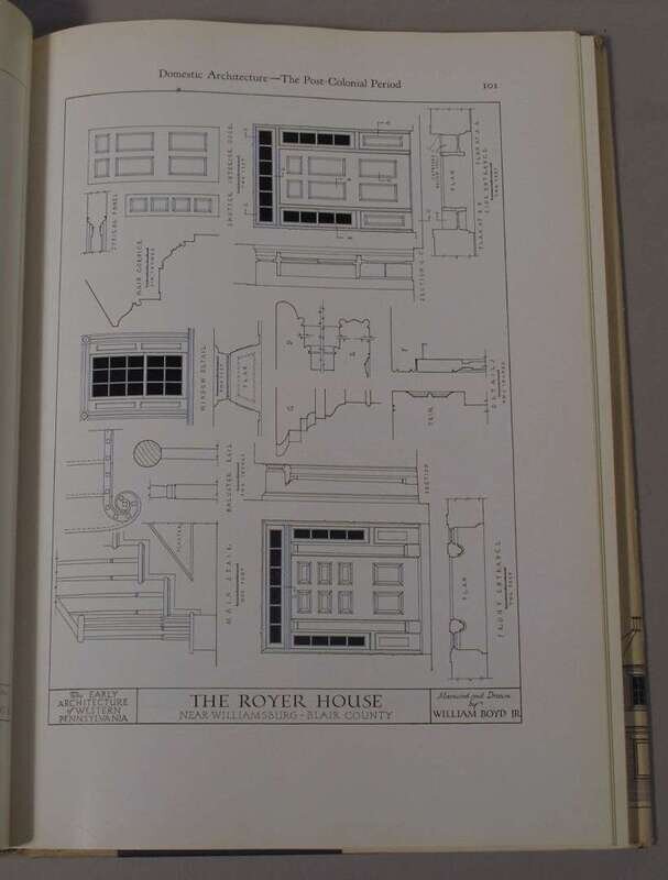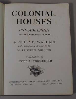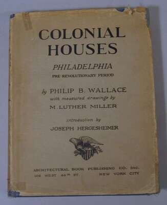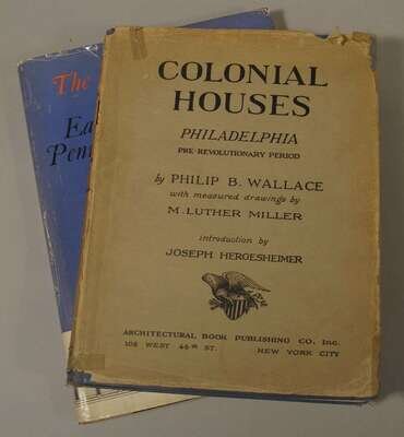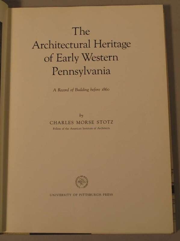 Architecture: Wallace, Philip B. Colonial Houses Philadelphia Pre-Revolutionary Period. New York, (1931). Drawings by M. Luther Miller. Introduction by Joseph Hergesheimer. 4to, orig. gilt-lettered blue cloth; corners bumped, other edge wear, d/j (cellotape repairs.) Photo plates, plans. Some spotting to front matter. * Stotz, Charles Morse. The Architectural Heritage of Early Western Pennsylvania. Univ. of Pittsburgh, (1966). Folio, orig. gilt-lettered two-tone cloth; minor wear, d/j (edge wear), photo plates, plans.
