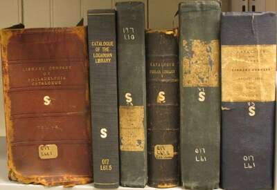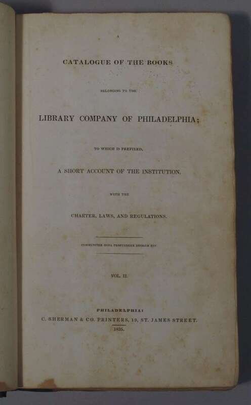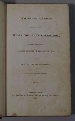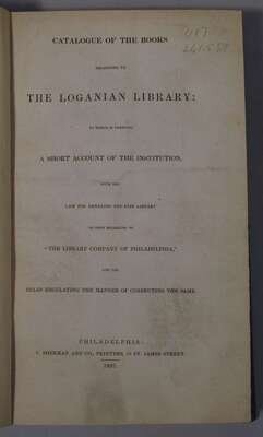 18th & 19th Century Library Catalogues: A Catalogue of the Books Belonging to the Library Company of Philadelphia. Phila.: Zachariah Poulson, 1789. 8vo, later 3/4 morocco & marbled bds; extremities rubbed, library label to spine. Title page loose. Library bookplate on front pastedown. Evans 22066.* A Catalogue of the Books Belonging to the Library Company of Philadelphia. Phila.: C. Sherman, 1835 (vol 1 and 2); 1856 (vol. 3). 3 vols. 8vo, later cloth and bds; scuffed and worn. Library markings to spine and title pages. Scattered spotting throughout. * Another set of the preceding vols, bound as 1, with additional supplement. 8vo, 3/4 leather and bds; extremities rubbed. * Catalogue of the Books Belonging to the Loganian Library. Phila: C. Sherman and Co., 1837. 8vo, modern cloth; library markings. New endpapers.