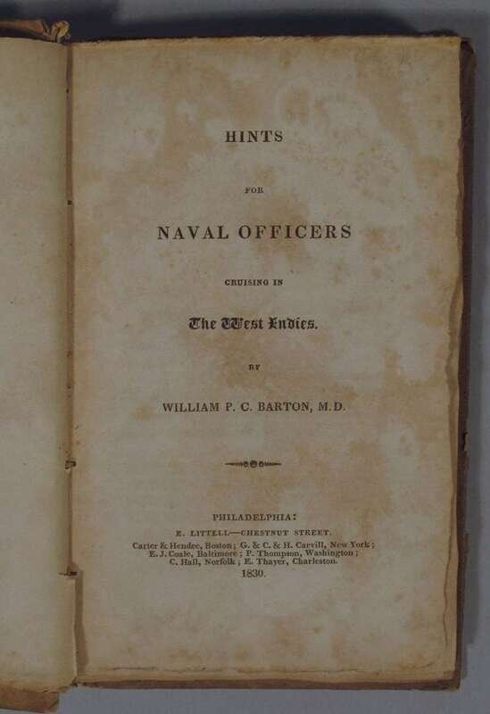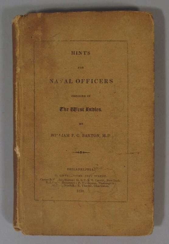 Barton, William P.C. Hints for Naval Officers Cruising the West Indies. Philadelphia, 1830. 1st ed. 12mo, orig. printed bds; corners & bumped, spine ends chipped, other occasional wear, slightly dusty. Untrimmed. Complete. Moderate internal dust smudging.