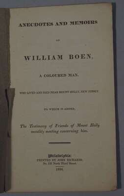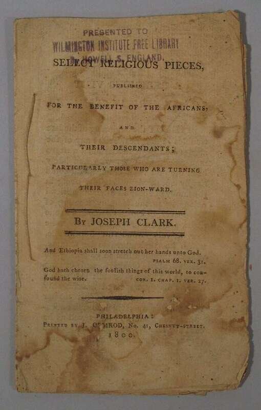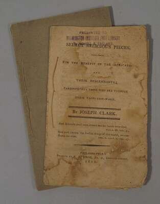 Clark, Joseph. Select Religious pieces published for the benefit of the Africans and their descendants: particularly those who are turning their faces Zion-ward. Phila: J. Ormrod, 1800. 12mo, orig. self-wrappers; stained and with edge wear. With previous owner's stamp at head of title. 12pp. Evans 37188. * Anecdotes and Memoirs of William Boen a Coloured Man. Phila: John Richards, 1834. 8vo, self-wrappers. 18pp.