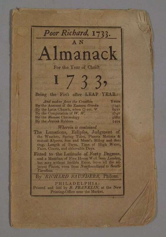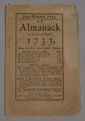 (Franklin, Benjamin.) Poor Richard. 1733. An Almanack for...1733. Philadelphia: B. Franklin, [1732]. [but Philadelphia: Appleton, 1847]. 12mo, orig. self-wrappers; mostly minor chipping.