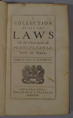 (Franklin, B(enjamin), printer.) [The Charters, A Collection of all the Laws, An Appendix of Laws formerly in Force.] [section title.]: A Collection of all the Laws of the Province of Pennsylvania: Now in Force. Philadelphia, 1752 [but 1753]. Folio, modern buchram. Lacking The Charter and the Appendix. Scattered light foxing, several quires browned, trimmed but with good margins. Without signatures a-h2; a-f2.
