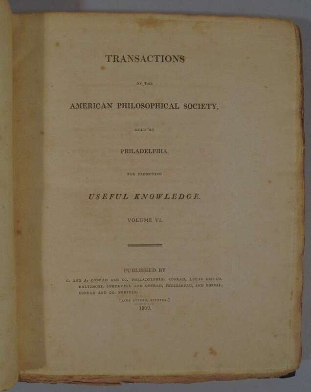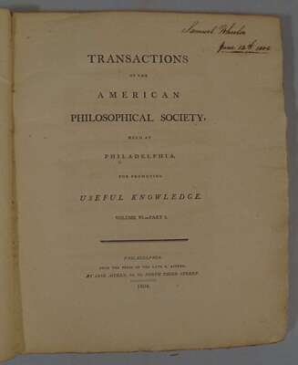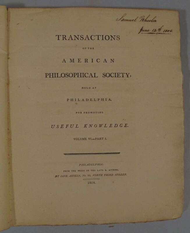 American Philosophical Society: Transactions. Philadelphia: Jane Aitken, 1804. Vol. VI. part I. 4to, orig. bds, paper spine label; scuffed, edges rubbed, small chip to label. With 4 engraved plates; moderately to heavily foxed, offsetting on text, scattered light foxing to text. Tear to pp109/110 - negligible paper loss. Untrimmed. Contemp. signature of Samuel Wheeler at head of title & front free endpaper recto. * Transactions. Philadelphia: Jane Aitken, 1809. Col. VI, (part II). 4to, orig. bds; minor dampstaining, some edge wear, small singe mark at fore edge of front bd. With 2 engraved plates, 3 charts, hand-colored engraved map (bound). Trimmed within top plate mark. 4pp adverts. Singe marks at several top edges. Untrimmed & largely unopened. Map title: A Map of the United States of America by Samuel G. Lewis. Some offsetting.