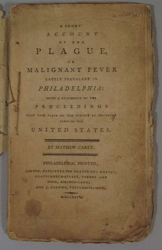 Carey, Mathew. A Short Account of the Plague or Malignant Fever Lately Prevalent in Philadelphia: With a Statement of the Proceedings in different parts of the United States. London, 1794. 1st English ed. 12mo, orig. sewn self wrappers, laid in to contemp. blank wrappers. Fold meteorlogical table made by David Rittenhouse. Some dust soiling to wrappers & text edges. Untrimmed. See Evans 25255-57 & 26735-37 for American eds.