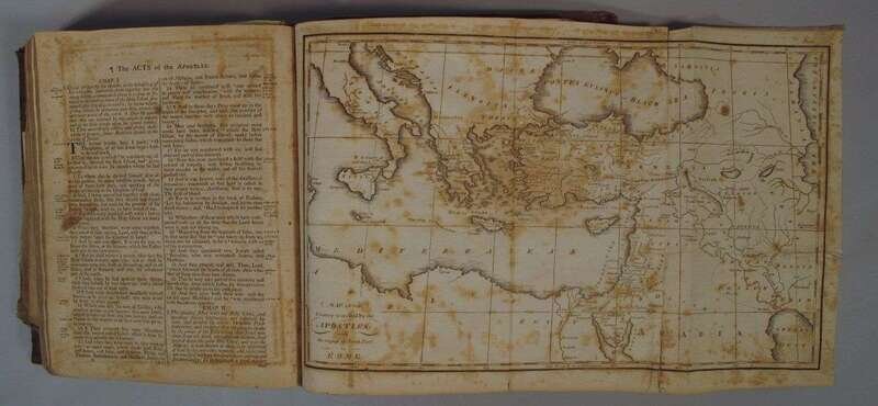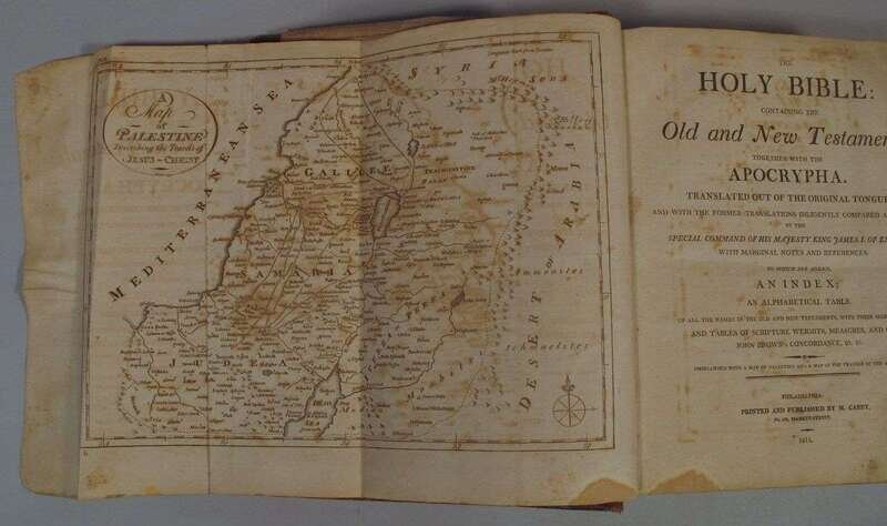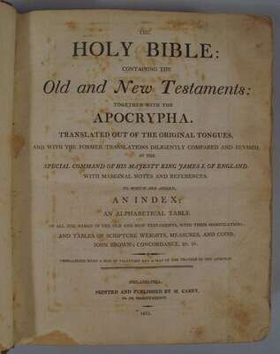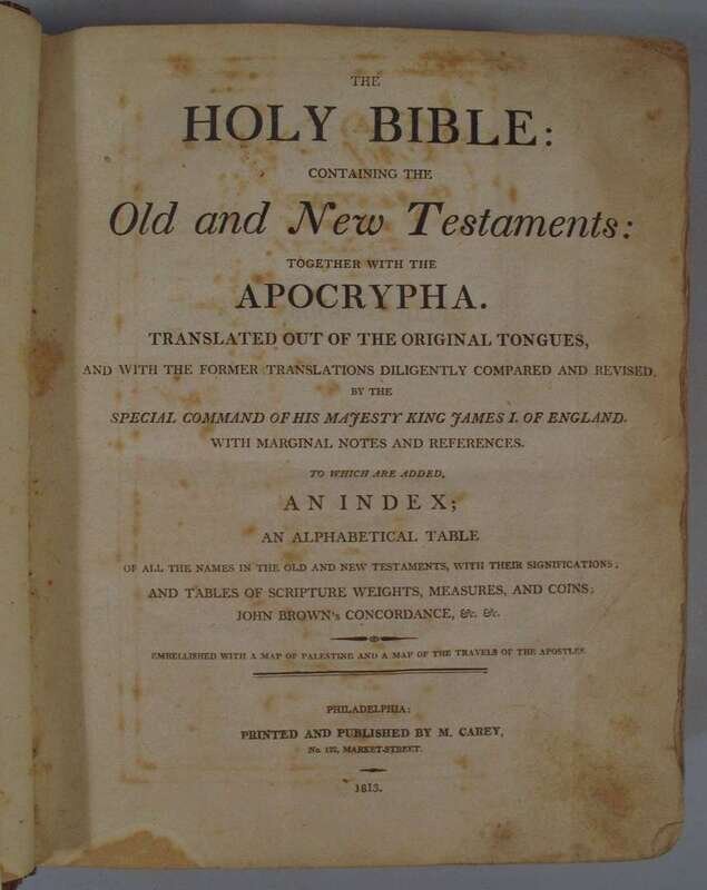 (Bible in English.) The Holy Bible: Containing Old and New Testaments: Together with the Apocrypha. Philadelphia: M. Carey, 1813. 4to, orig. calf, red morocco spine label; scuffed, joints, edges & spine ends rubbed. With 2 engraved maps. Endpapers creased & moderately foxed, other scattered light to moderate foxing & spotting, maps moderately foxed. 1080pp. Bound with: Brown, John A. Brief Concordance... Brooklyn: Thomas Kirk, 1812. 4to, 62pp. Ownership signature & annotations relating to the purchase of this bible in Wilmington in 1813 for 6 dollars by Sarah Michener on front blank. Ms Michener, Mendenhall & related family records.