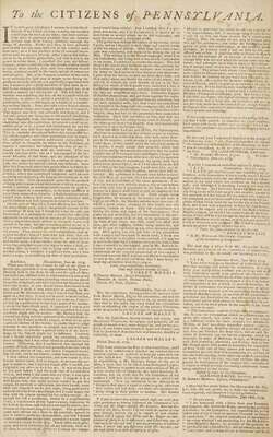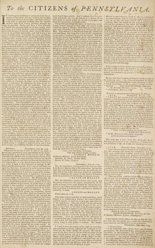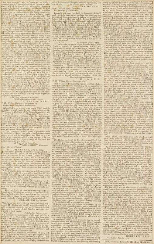 (Printed Sheet.) Morris, Robert. "To the Citizens of Pennsylvania...Robert Morris, July 7, 1779. Philadelphia, 1779." Philadelphia, n.d. [c1780]. Folio sheet, 2pp, scattered light foxing. Framed.