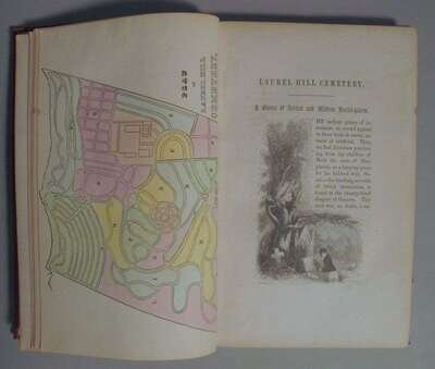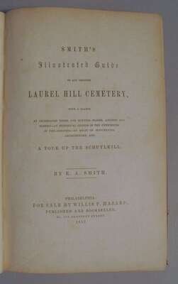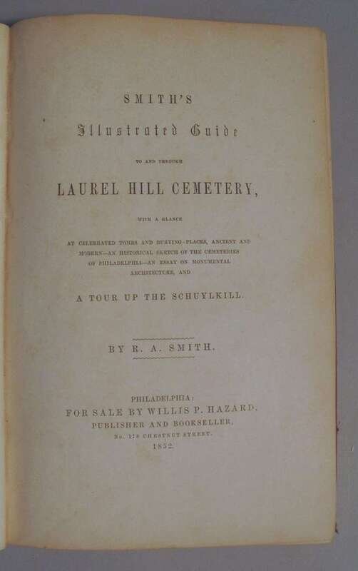 Smith, R.A. Smith's Illustrated Guide to and Through Laurel Hill Cemetery. Philadelphia: Willis P. Hazard, 1852. 1st ed. 8vo, orig. gilt-pictorial & blind stamped red cloth; corners bumped, spine ends chipped away. With frontis hand-colored frontis map, plates, full-page & text illus. Light offsetting, minor spotting. Book plate of John Gilpin on front paste down. Complete, sound copy.
