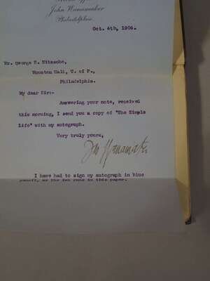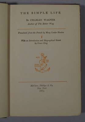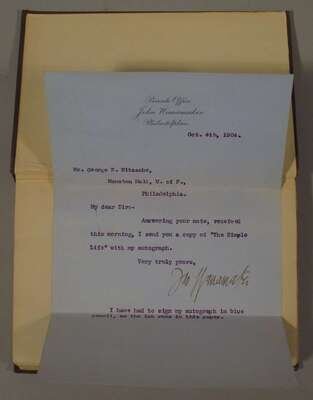 (Wanamaker, John.) Wagner, Charles. The Simple Life. New York: McClure, Phillips & Co., 1904. 8vo, gilt-lettered olive cloth; corners bumped, extremities scuffed, with some small dents. Signed, dated and inscribed by John Wanamaker on front free endpaper. Also with John Wanamaker, TLS, Oct. 4, 1904, on Wanamaker letterhead mounted to back free endpaper verso.