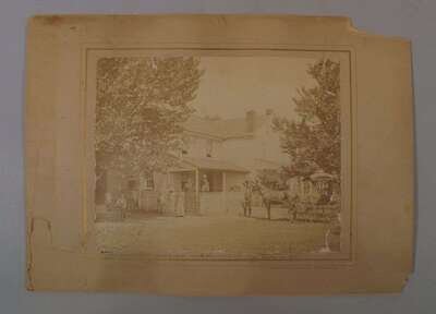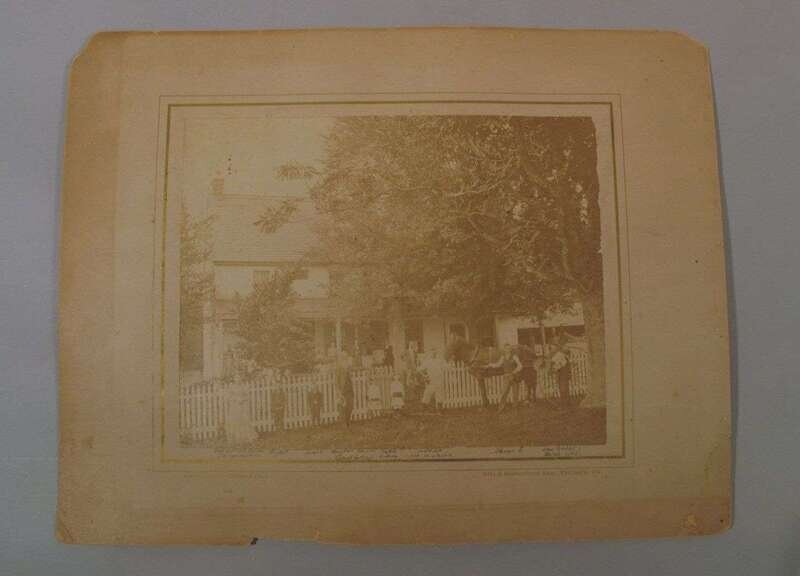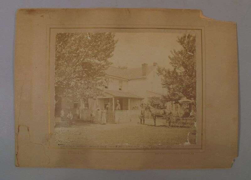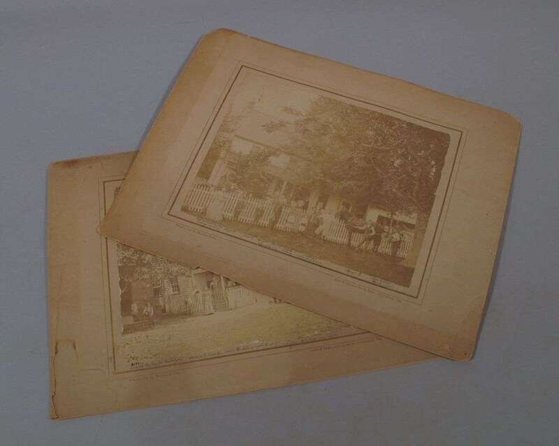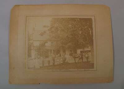 (Orig. 19th Century Photos) A. Morse & Co. Philadelphia. Brinton family members outdoors - group potrait - showing the family house, house drawn carriage, & section of grounds. Philadelphia, c1880. Albumen prints, 7 x 8 3/8 inches; 180 x 225mm on orig. mount. Dusty & chipped to edges. Family members identified in ink on mount below image.