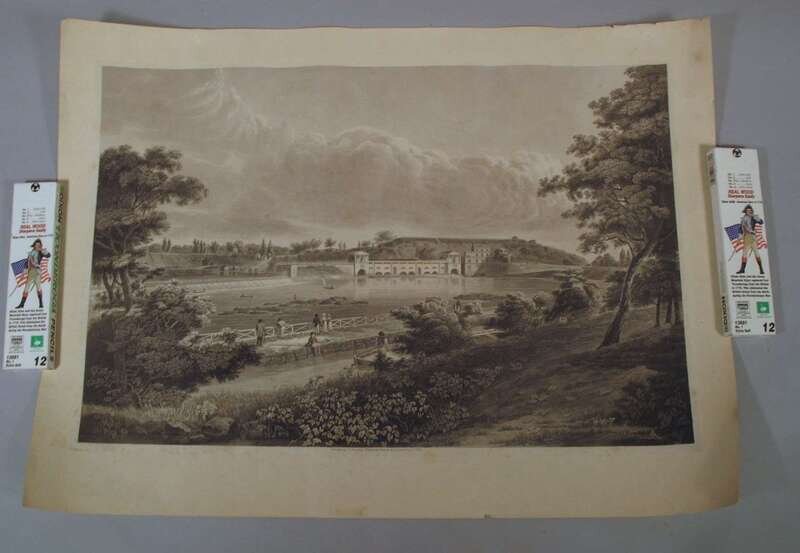Aquatint. Hill, I. after Doughty, T. [Fairmount Waterworks.] [Philadelphia], [1825]. 15 7/8 x 23 3/4 inches; 403 x 603 mm. Trimmed just outside of image, text at bottom trimmed away, laid in larger modern sheet, minor foxing at edges. Uncolored.