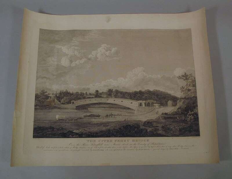 Engraving. Plocher, Jacob J, after Birch, Thomas. "The Upper Ferry Bridge Over the River Schuylkill near Morris Street in the County of Philadelphia." [Philadelphia], [c1815]. 22 x 15 3/4 inches; 558 x 400 mm, wide (full?) margins. Lightly & attractively toned, scattered wear - including small tears & dampstaining in margins. Uncolored.
