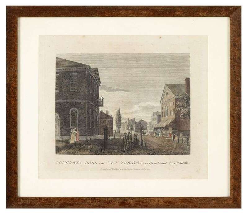 Hand-Colored Engraving. Birch, William & Son, after. "Congress Hall and New Theatre, in Chestnut Street." Philadelphia, 1800. 1st ed. [Birch's Phila. Views, plate 20.] 11 3/4 x 13 1/4 inches; 298 x 336mm, good margins. Slightly toned. Attractive orig. color. Not examined out of archival frame.